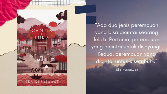 Setelah saya mengerti bahwa sebelum membaca buku hendaknya tidak menaruh ekspektasi apa pun agar si penulis -yang tidak seharusnya- menanggung rating jelek karena kecewa akibat tidak terpenuhinya ekspektasi yang kita bangun sendiri, Cantik itu Luka mengajarkan pada saya bahwa membaca sebuah karya seseorang itu hendaknya menggunakan pendekatan yang berbeda-beda. Paling tidak memahami dan memposisikan diri, melihat dari point of view penulis dan barulah mengikuti alur cerita. Untuk apa? Ya, tentu saja agar mencapai ‘orgasme’ dalam membaca.